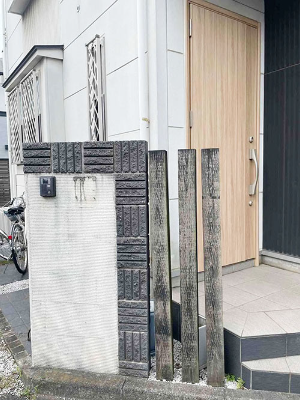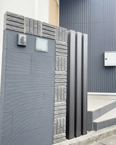 門塀は気分を変えて白系から黒系カラーへ。飾り木も同様黒系に統一し、シックにまとまりました。