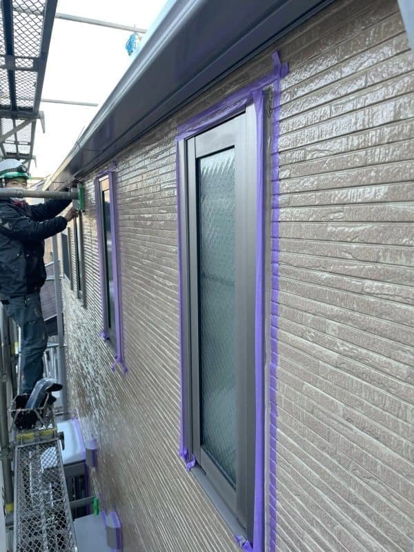 足場をつくり、まずは屋根・外壁・バルコニーなどを高圧洗浄で汚れを落としてきれいにしていきます。