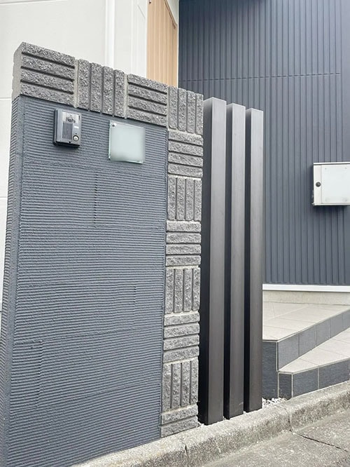 門塀は気分を変えて白系から黒系カラーへ。飾り木も同様黒系に統一し、シックにまとまりました。