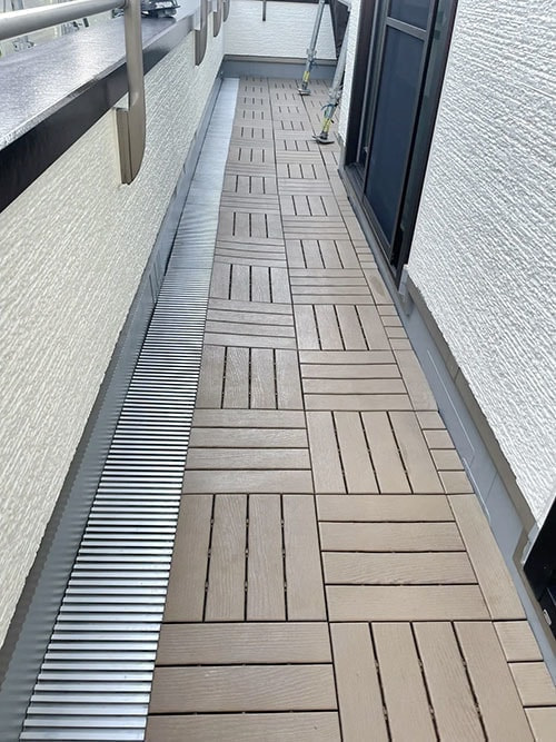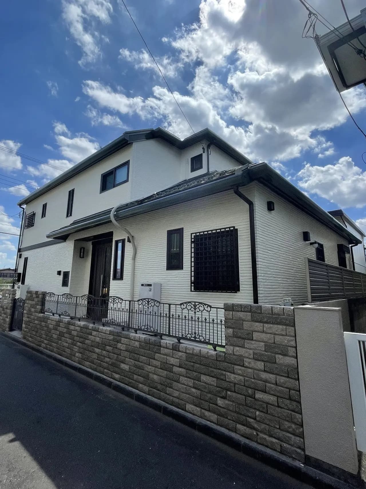 小平市K様邸の外壁塗装およびバルコニー改修工事のご案内です。築20年のお宅を購入されたお客様からのご依頼です。外壁にはホワイト系カラーを選ばれ、シックながらも明るい雰囲気に。目地シーリングが古くなっていたため、すべて撤去したうえで打ち直し、強度も向上しました。バルコニーは、バルコニー床の補修・防水加工をしっかりと施した後、高圧洗浄で綺麗にした既存のウッドデッキ調パネルを組み直しました。