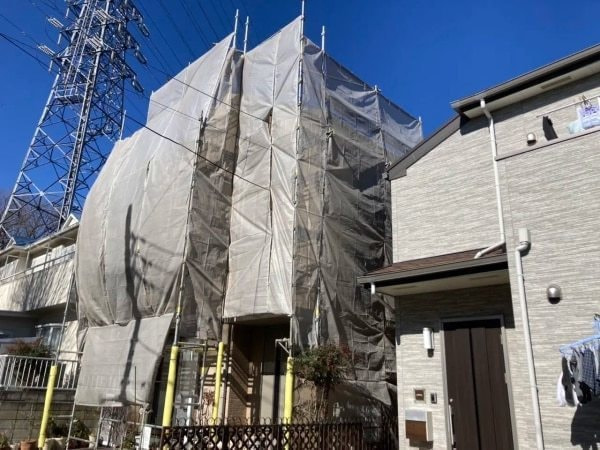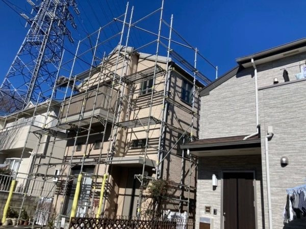 足場をつくり、まずは屋根・外壁・バルコニーなどを高圧洗浄で汚れを落としてきれいにしていきます。